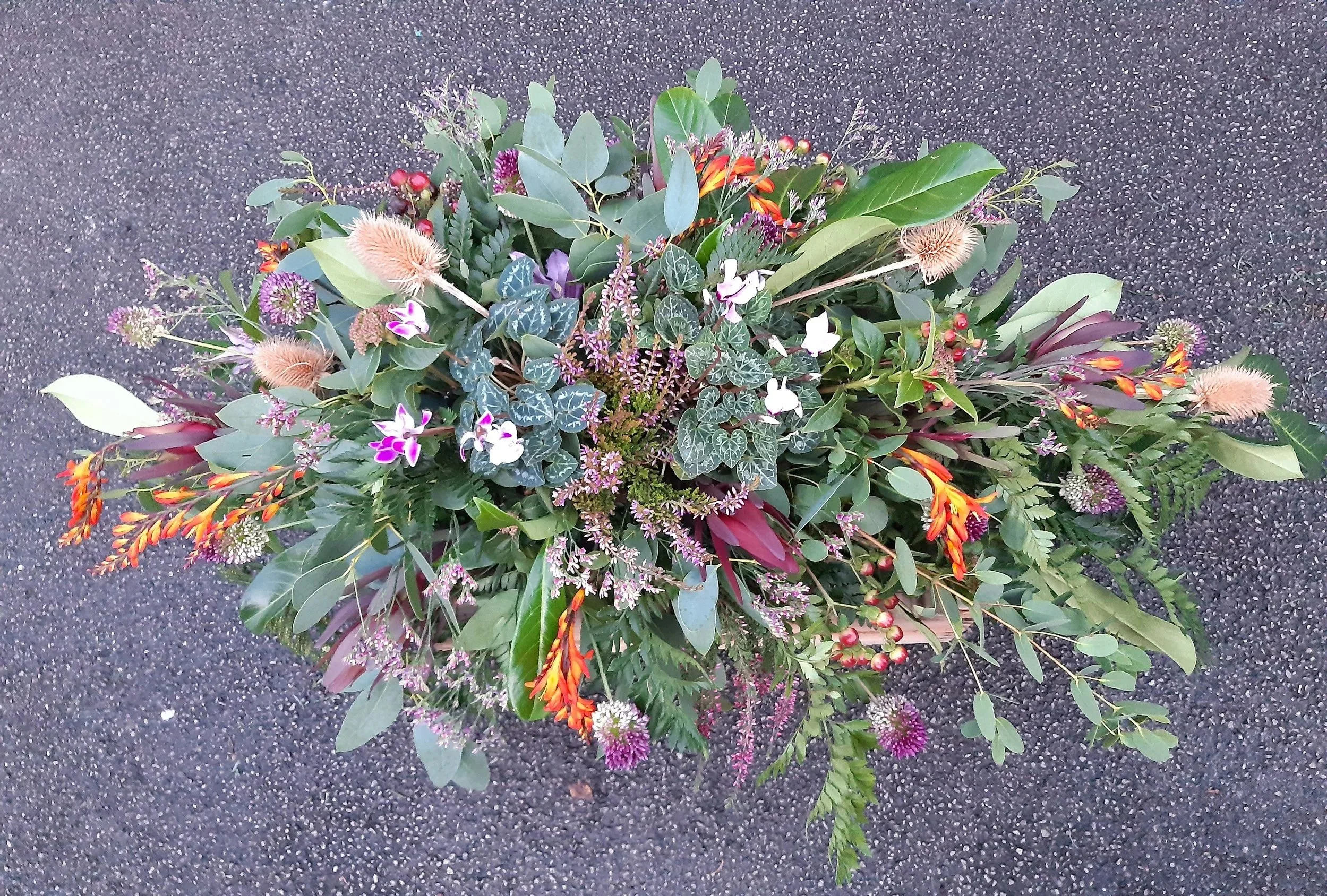 A beautiful alternative to a coffin spray is a living design, using seasonal plants which will continue to bloom for your loved one.